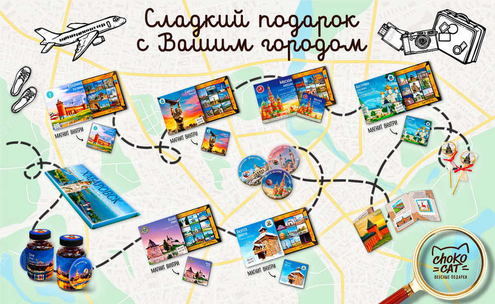 Музеи и выставки чаще всего посещают гости города, а они всегда в поиске сувениров. Наборы CHOKOCAT с национальной и городской тематикой пользуются у них особым спросом.
