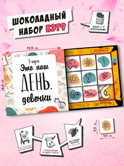 8 Марта - это твой день! Пускай каждый день будет, как праздник. Самая продаваемая серия. Набор с 9 молочными шоколадками, где каждая плитка завёрнута в красочную этикетку со своим индивидуальным дизайном и приятным посланием. Формат позволяет уместить больше продукции на полку. На обороте коробочки увлекательная игра.