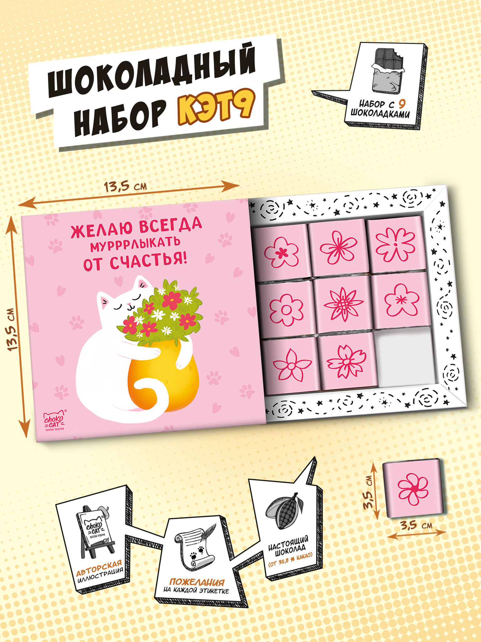 Набор с 9 молочными шоколадками, где каждая плитка завёрнута в красочную этикетку со своим индивидуальным дизайном и приятным посланием. Формат позволяет уместить больше продукции на полку. На обороте коробочки увлекательная игра.