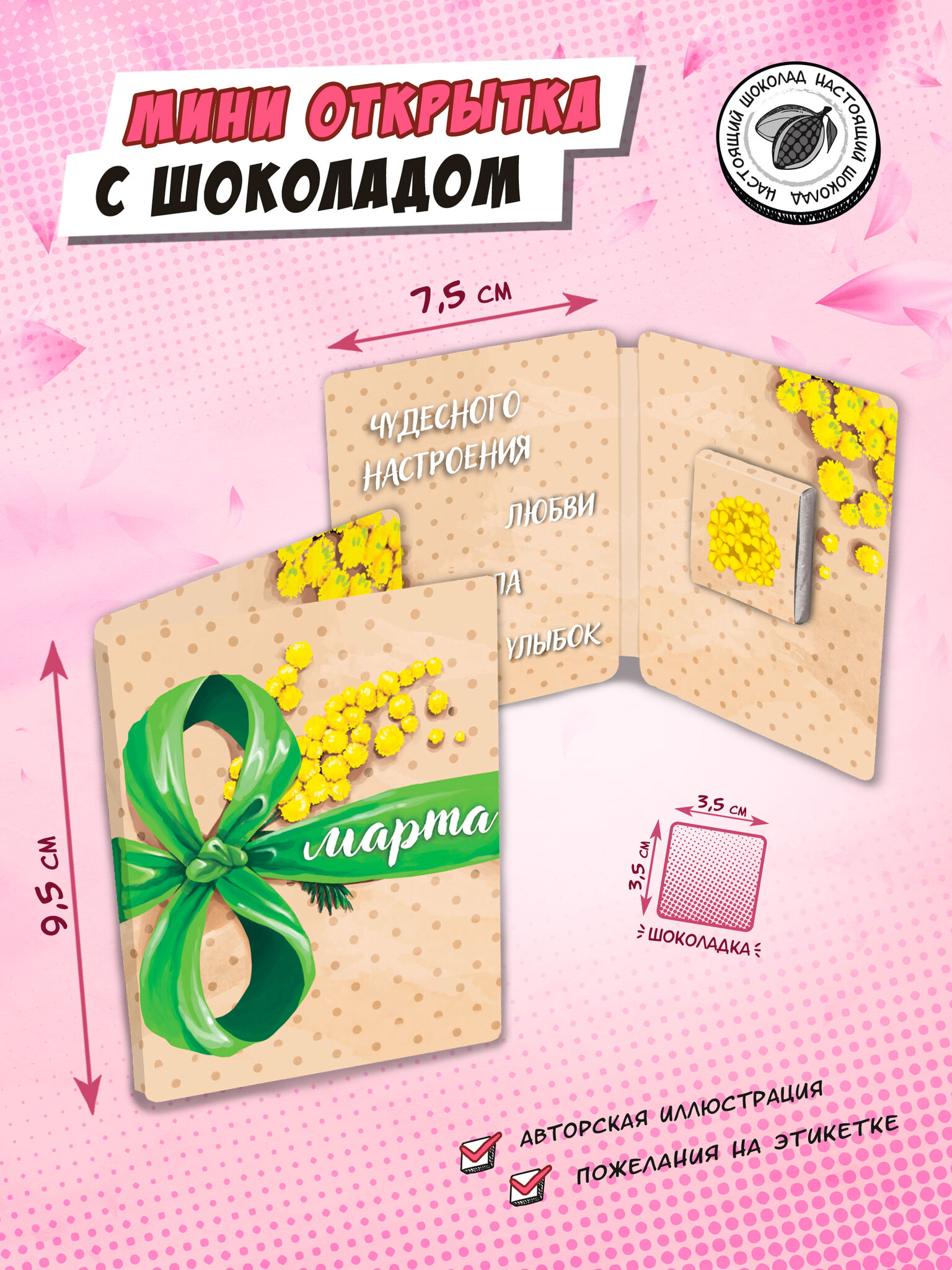 Мини открытка, С 8 МАРТА. ЗЕЛЕНЫЙ БАНТ , молочный шоколад, 5 гр., TM Chokocat