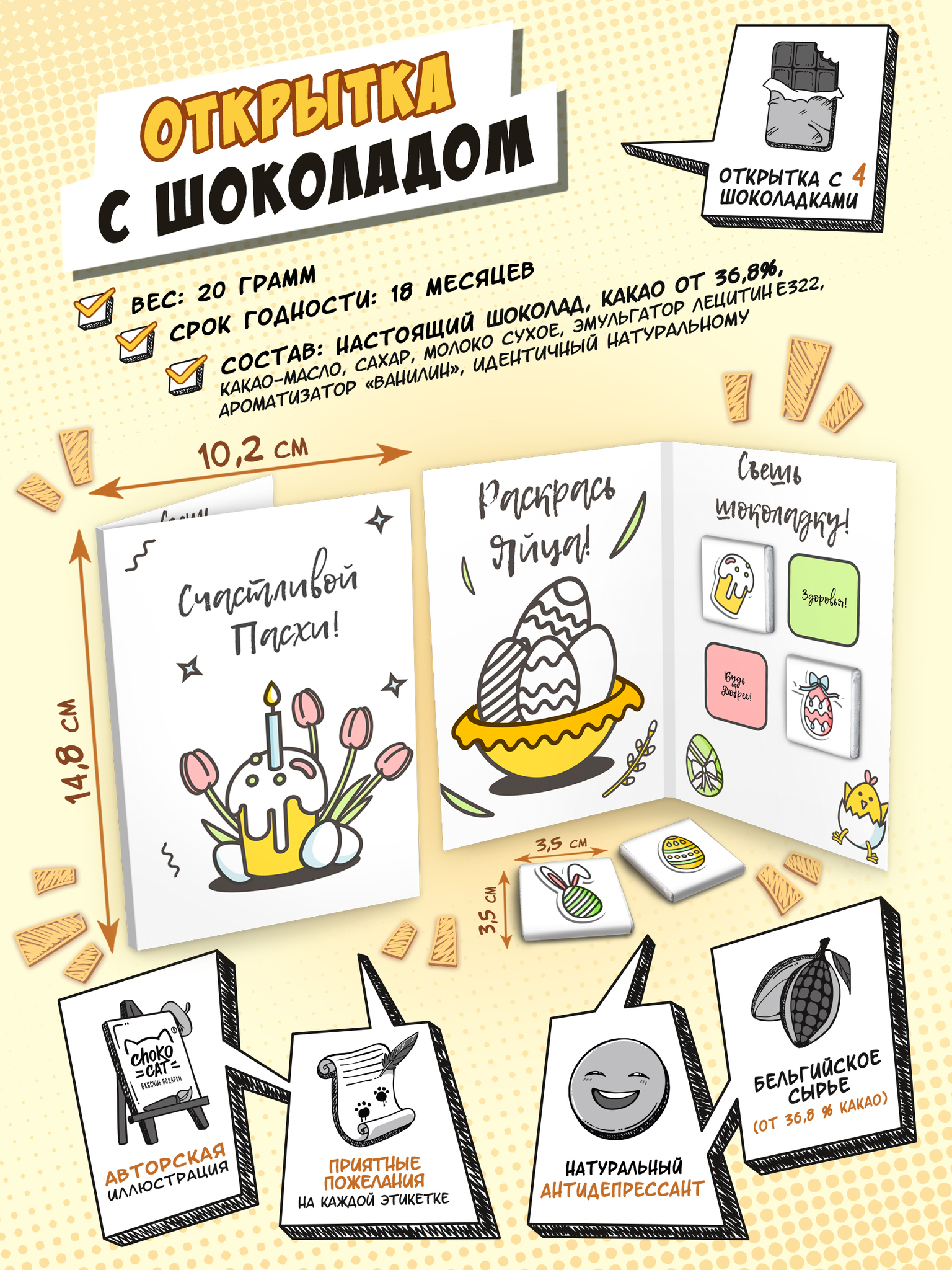Поздравить близких в светлый праздник. Яркие и современные открытки на любой повод, внутри которых 4 молочных шоколадки по 5 граммов. Каждая обёрнута в этикетку с оригинальной иллюстрацией.
